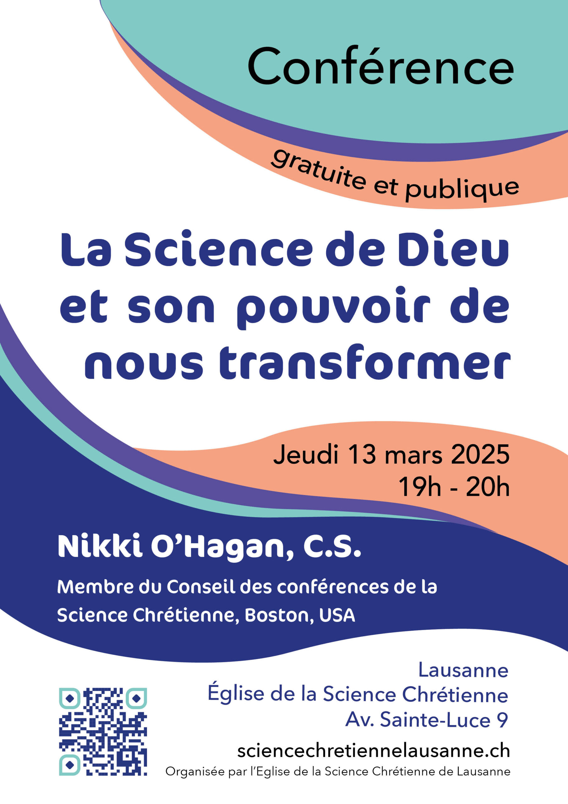Conférence La science de Dieu et son pouvoir de nous transformer Conférencière : Nikki O’Hagan, Irelande Jeudi 13 mars 2025 – 19h – 20h Eglise de la Science Chrétienne Lausanne – Avenue Sainte Luce 9 – 1003 Lausanne Sur la conférence Les idées fausses sur nous-mêmes et sur le monde dans lequel nous vivons sont … Lire plus
